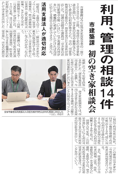 宮古島市建築課の空き家対策事業の一環で初の空き家相談会が開催され、14件の相談がありました。当センターを含む「空き家等管理活用支援法人」に指定された3団体で対応し、管理・利活用や相続後の扱いなど多様な悩みに専門家が助言。相談会での取組が地域課題解決の事例として紹介されました。