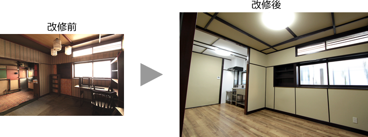 当センターでは空き家の活用を促進するため、北斗ソリューションズ株式会社(外部リンク)と協力して、投資を負担せずに利用できる空き家活用として「AKARI(あかり)」(空き家借り上げ制度)を開発しました。事業会社が空き家を3~7年間借上げ、大規模なリノベーションを行った上で、賃貸戸建や店舗、民泊などの活用を行うというサービスを利用した活用事例をご紹介します。