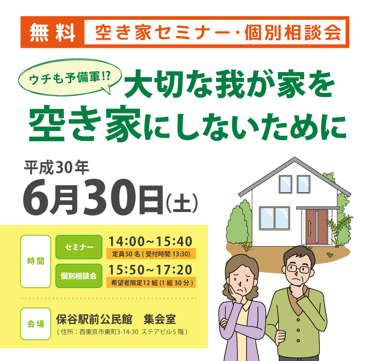 | 開催日時 | 2018年6月30日(土) ・セミナー 14:00~15:40(受付 13:30) ・個別相談会 15:50~17:20(希望者限定先着12組 ※1組30分) |