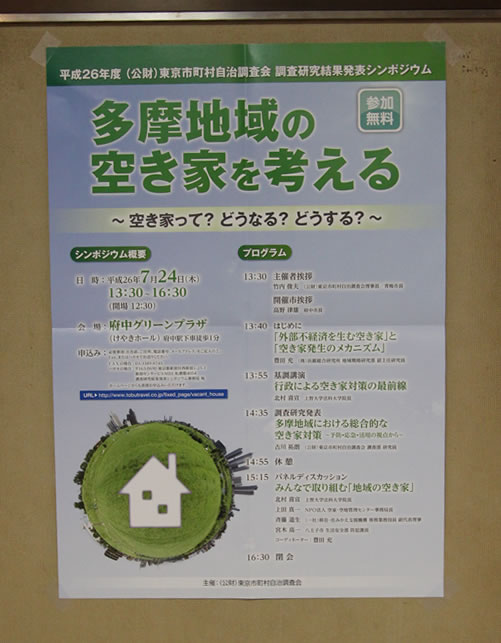 多摩・島しょ地域の市町村の自治に関する調査研究などを行う、東京市町村自治調査会が主催するシンポジウムに当センターの事務局長が、空き家について討論させていただくパネリストとして参加いたします。
